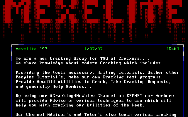 NAME.: MEXC4N.zip tEAM.: CRACKiNG FOR NEWBiES C4N tYPE.: Zip / DOS DATE.: 1997 SiZE.: 40.00 KB LiNKS: [DOWNLOAD] [DF2 MiRROR] [ViRSCAN] [EMULATE]