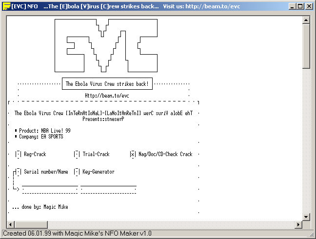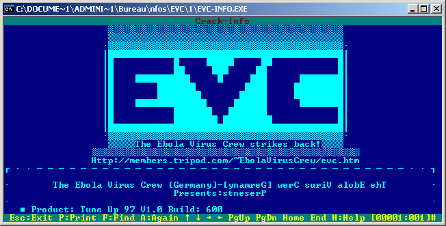 NAME.: evc1.zip tEAM.: EBOLA ViRUS CREW EVC tYPE.: Zip / DOS DATE.: 1996 SiZE.: 10.67 KB LiNKS: [DOWNLOAD] [DF2 MiRROR] [ViRSCAN] [EMULATE]